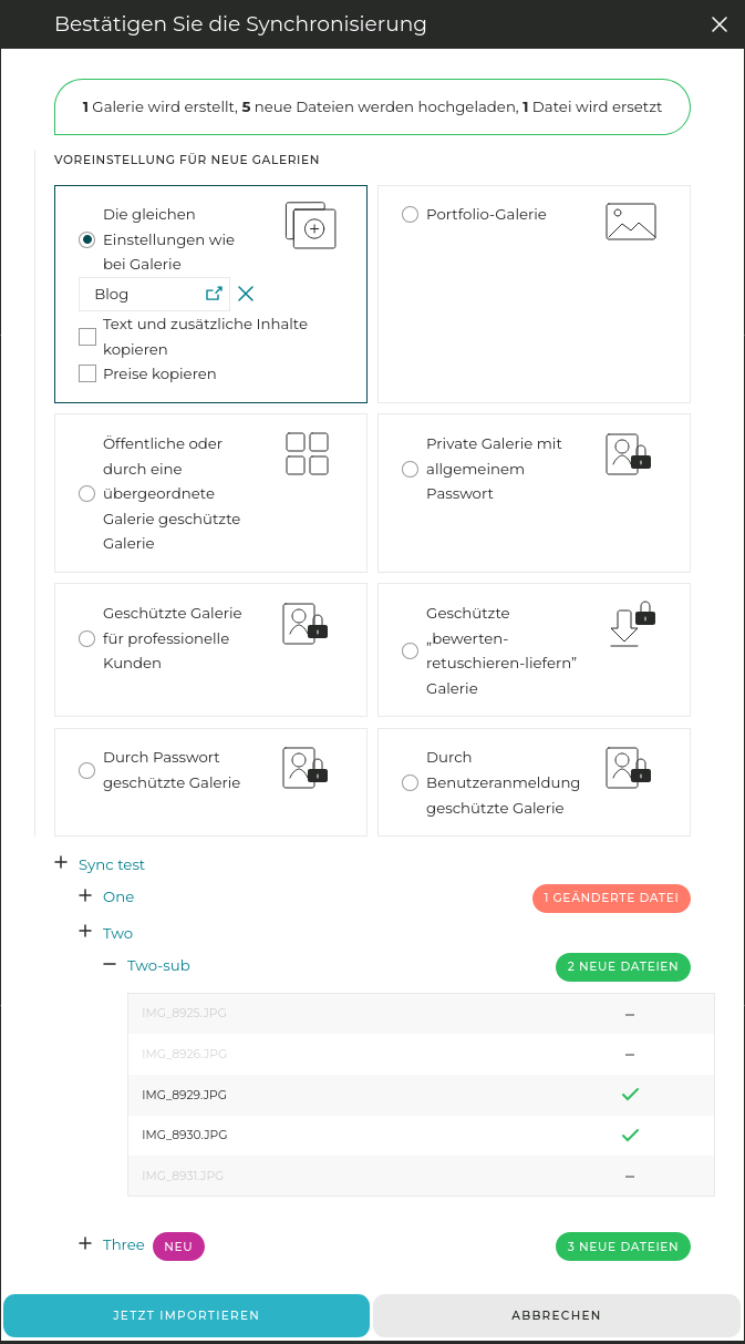 - Massenhaftes Hochladen von Ordnern: Synchronisieren Sie ganze Ordnerbäume auf einmal und bewahren Sie dabei Ihre vororganisierte Struktur. Perfekt, um große Shootings zuzustellen oder von einer anderen Plattform umzusteigen.