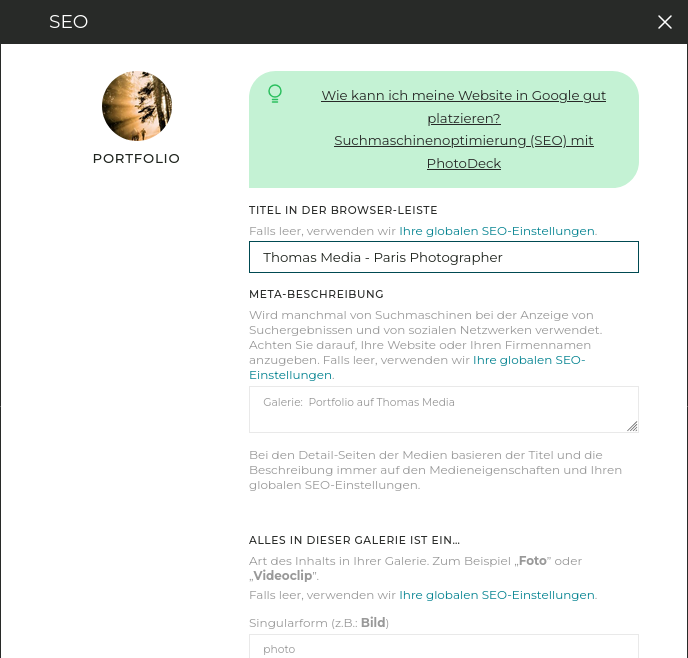 PhotoDeck unterstützt Ihre Suchmaschinenoptimierung (SEO) mit Tools, mit denen Sie verwalten können, wie Ihre Website in Suchmaschinen angezeigt wird.