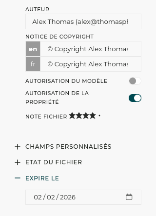 Chaque ressource peut comporter des métadonnées intégrées relatives au copyright, à l’auteur et à la publication, ainsi que des champs personnalisés pour les conditions de licence spécifiques. L’expiration automatique des fichiers empêche le téléchargement des ressources une fois leur période de licence expirée, et des rappels par email signalent les expirations à venir avant qu’elles ne deviennent un problème de conformité.